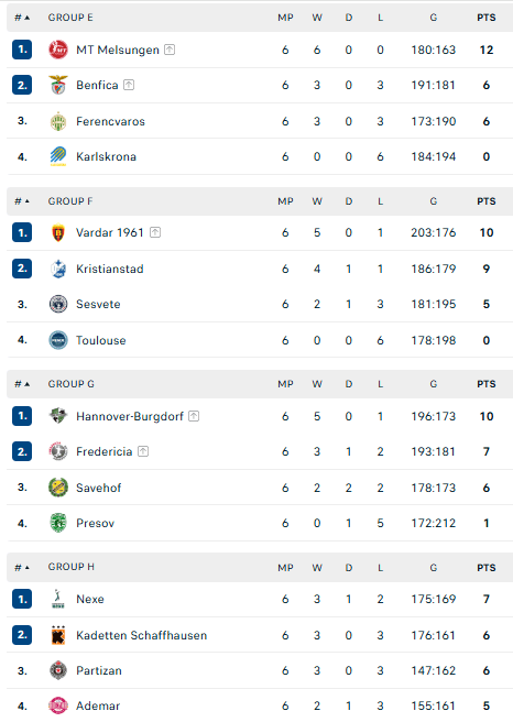Visas šešerias šio etapo rungtynes laimėjo trys Vokietijos komandos: „Flensburg-Handewitt“, „Kiel“ ir „Melsungen“. Ketvirtai Vokietijos komandai „Hannover“ nepavyko išvengti vienos nesėkmės, bet ji, iškovojusi penkias pergales, irgi tapo grupės nugalėtoja.