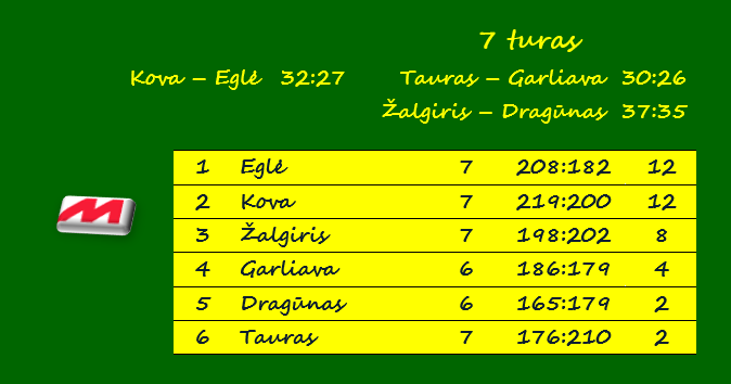 Šešių pergalių virtinę nutraukusi „Eglė“ ir „Kova“ per septynerias rungtynes iškovojo po 12 taškų ir dalijasi pirmąją vietą.