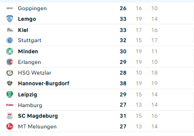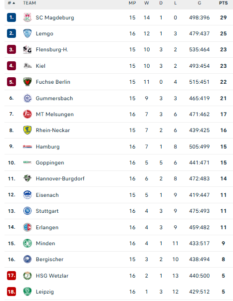 Pirmauja: „Magdeburg“ – 29, „Lemgo“ – 25, „Flensburg“, „Kiel“ – po 23, „Füchse“ – 22, „Gummersbach“ – 21, … „Stuttgart“ – 11, „Minden“ – 9, „Bergische“ – 8.