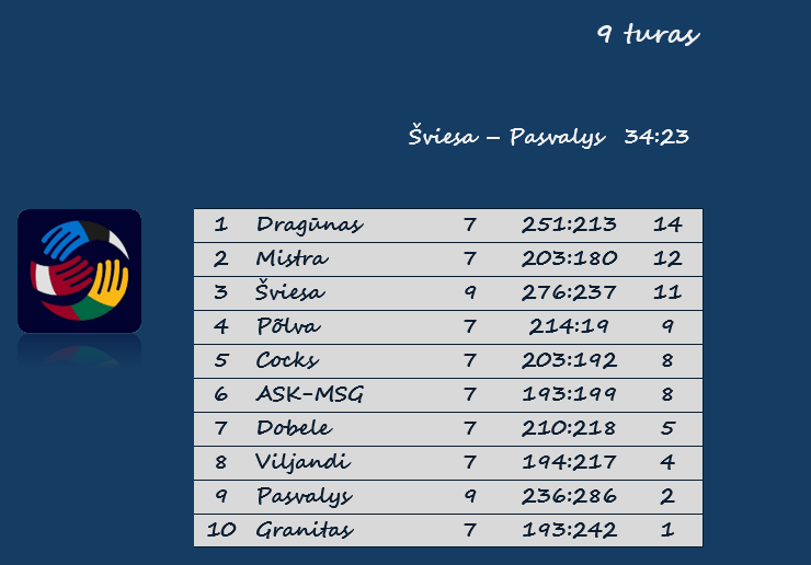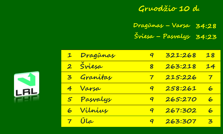 Vienvaldis lygos lyderis „Dragūnas“ laimėjo visas devynerias rungtynes ir turi 16 taškų. Vieną kartą suklupusi „Šviesa“ per aštuonerias rungtynes surinko 14 taškų.