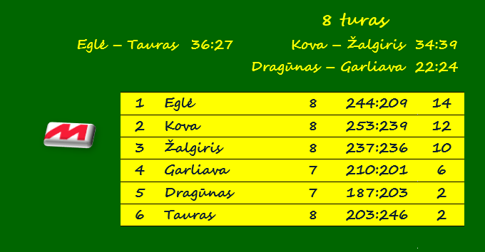 Nuo rugsėjo pabaigos šešias iš eilės pergales pasiekusi „Kova“ aštuntajame ture namie labai rezultatyviose rungtynėse nusileido Kauno „Žalgiriui“ 34:39 (17:21). Tuo tarpu „Garliava“, nuo spalio pabaigos patyrusi keturis iš eilės pralaimėjimus, nerezultatyviose rungtynėse išvykoje palaužė Klaipėdos „Dragūną“ 24:22 (11:11).