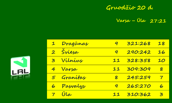 Tuo tarpu „Varsa“ po šeštadienį pasiektos pergalės pakilo į ketvirtąją vietą. Alytaus rankininkai per 11 rungtynių iškovojo 8 taškus. Tiesa, alytiškių aplenktas „Granitas“, kuris turi 7 taškus, žaidė dar tik 8 rungtynes.