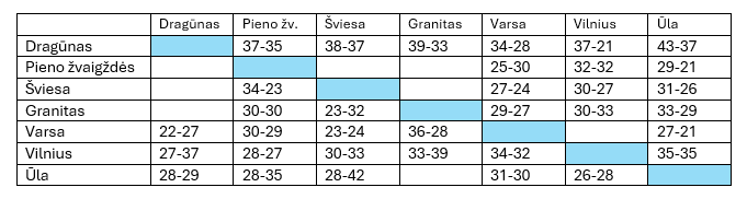 | Praleisti įvarčiai | 21 – Pasvalys (su Ūla), Dragūnas (su Vilniumi) | |