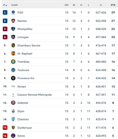 Pirmauja: PSG – 29, „Nantes“ – 27, „Montpellier“ – 25, „Limoges“ – 20, … „Istres“ – 5.