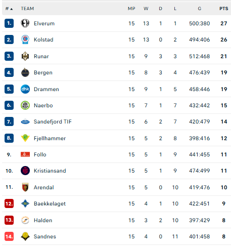 Pirmauja: „Elverum“ – 27, „Kolstad“ – 26, „Runar“ – 21, „Bergen“, „Drammen“ – po 19, … „Kristiansand“ – 11.
