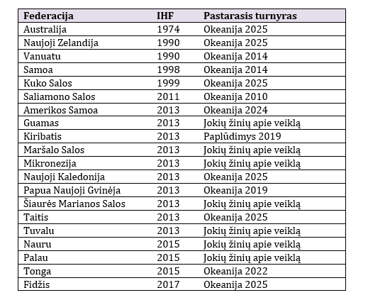 Žemiau pateiktoje lentelėje pažymėta, kuriais metais nacionalinė federacija įstojo į IHF, ir kada pastarąjį kartą dalyvavo IHF rengiamose varžybose: Okeanijos jaunimo pirmenybėse arba paplūdimio rankinio turnyruose.