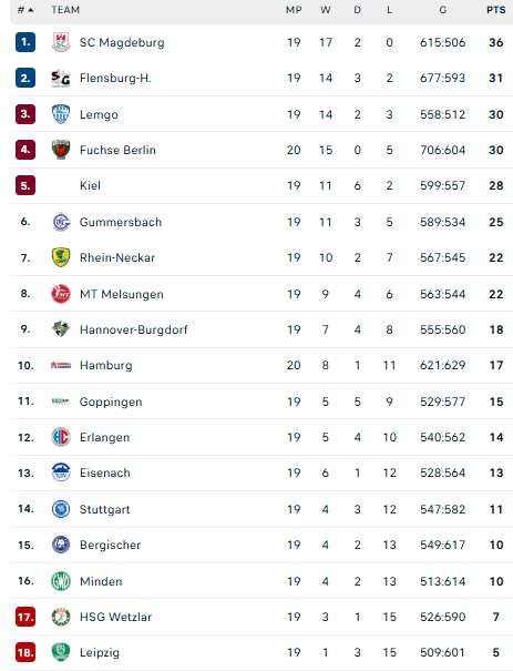 Bundeslygoje antrąją vietą užimantis „Flensburg-Handewitt“ turi 31 tašką, trečiąją vietą besidalijantys „Lemgo“ ir Vokietijos čempiono vardą ginantis Berlyno „Füchse“ – po 30 taškų, vilties įsiveržti į prizininkų trijulę neprarandantis „Kiel“ – 28 taškus.
