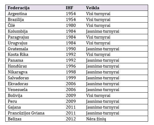 Lentelėje pažymėta, kuriais metais nacionalinė federacija įstojo į IHF ir kokio lygio turnyruose dalyvauja šalies rinktinės.