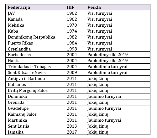Šiaurės Amerikos ir Karibų zonai priklauso 21 nacionalinė federacija, bet tik septynios iš jų IHF narėmis tapo XX amžiuje. Net dešimt federacijų iš nedidelių Karibų šalių į IHF buvo priimtos per pastaruosius penkiolika metų.