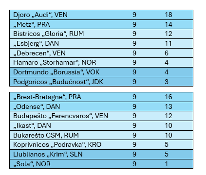 Devintajame ture pirmąjį tašką pagaliau iškovojo B grupės autsaiderė „Sola“. Norvegijos komanda išvykoje sužaidė lygiosiomis su Liublianos „Krim“ 22:22.