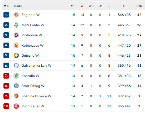 Pirmauja: „Zaglębie“ – 42, „Lublin“ – 36, „Piotrcovia“ – 27, „Kobierzyce“ – 27, „Gniezno“ – 21, … „Sośnica“ – 7.
