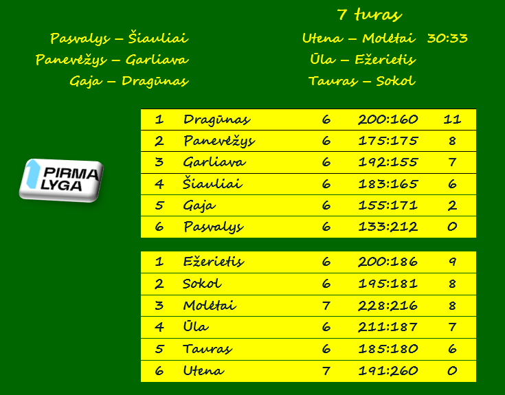 Penktadienį prasidėjo Lietuvos vyrų rankinio pirmosios lygos septintasis turas. Pirmosios žaidė dvi Aukštaitijos komandos, kurių rungtynėse „Molėtai“ išvykoje nugalėjo „Uteną“ 33:30 (20:17).