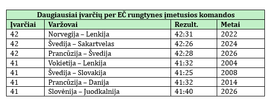 Abi komandos kartu pelnė 81 įvartį. Tai – Europos pirmenybių rekordas. Iki penktadienio rekordas buvo 77 įvarčiai ir nesikeitė nuo 2016 metų, kai Baltarusijos rinktinė 39:38 nugalėjo Islandijos rankininkus.