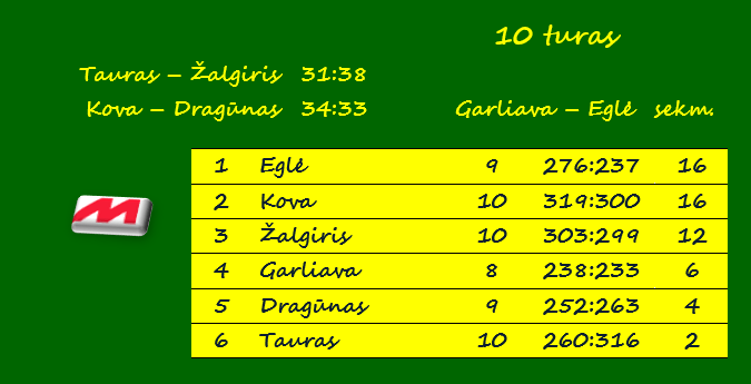 | Praleisti įvarčiai | 31 – Žalgiris (su Tauru) | 19 – Eglė (su Dragūnu) |