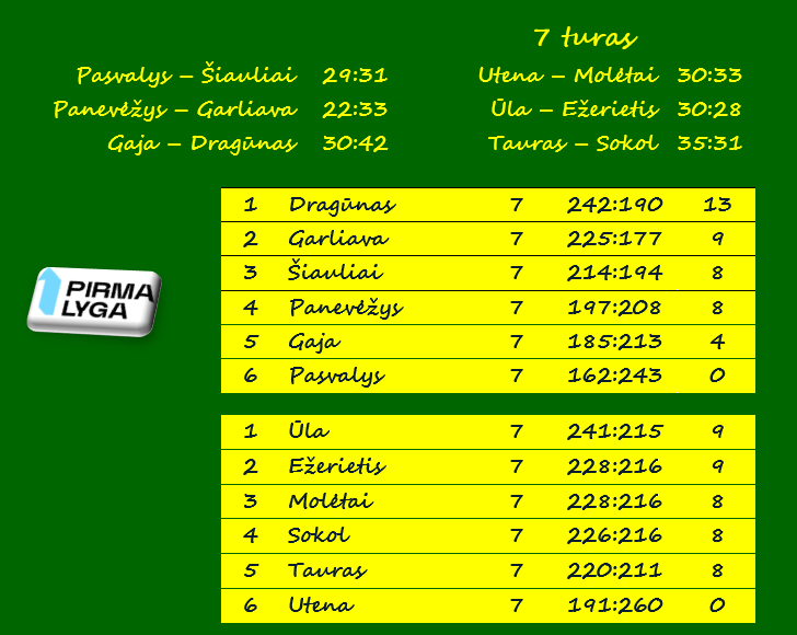 „Dragūno“ dubleriai po septynių turų turi 13 taškų. Tuo tarpu tris komandas, kovojančias dėl antrosios vietos, skiria vos vienas taškas. „Garliava“ surinko 9 taškus, „Šiauliai“ ir „Panevėžys“ – po 8 taškus.