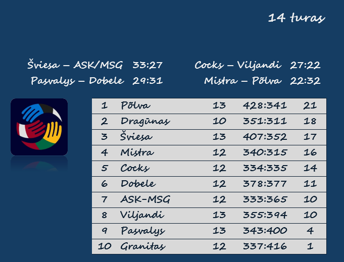 Rasiku „Mistra“ – Pylvos „Serviti“ 22:32 (14:19). Vare 7, Orlovskis 7 / Rooba 7, Varulas 7, Saksingas 5.