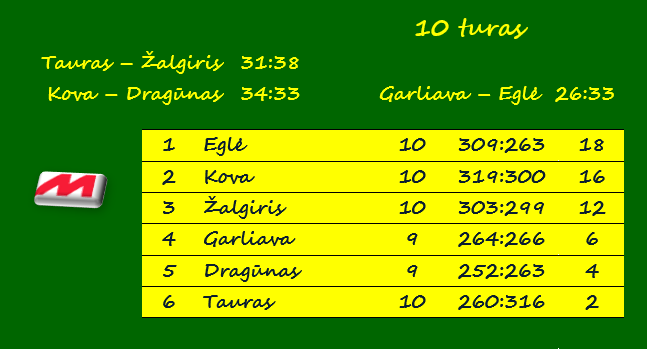 Visos trys lyderės antrąjį ratą jau baigė. „Eglė“ per dešimt rungtynių iškovojo 18 taškų, Panevėžio „Kova“ – 16, Kauno „Žalgiris“ – 12.