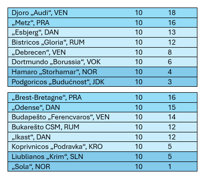 Dėl dviejų tiesioginių kelialapių į ketvirtfinalį B grupėje kovoja trys komandos, kurias skiria vos du taškai. „Brest-Bretagne“ turi 16 taškų, „Odense“ – 15, „Ferencvaros“ – 14. Iki grupių varžybų pabaigos liko keturi turai.
