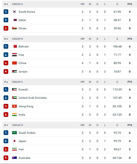 Antrojo etapo I grupėje žais Korėja, Kuveitas, Irakas ir Japonija, II grupėje – Bahreinas, Saudo Arabija, Kataras ir Jungtiniai Arabų Emyratai.