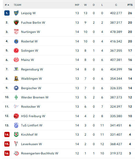 Pirmauja: „Leipzig“ – 26, „Füchse“, „Nurtingen“, „Rodertal“ – po 20, … „Lintfort“ – 6.