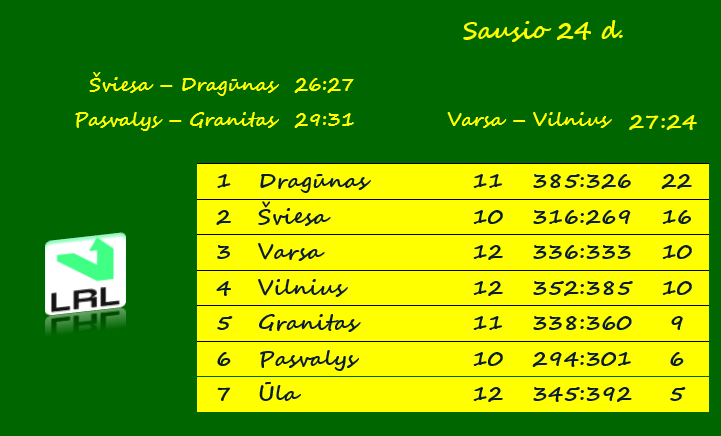 | Įmesti įvarčiai | 31 – Granitas (su Pasvaliu) | 43 – Dragūnas (su Ūla) |