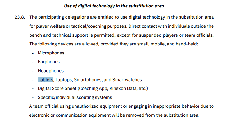 Portugalas turnyro nuostatų nepažeidė. 23.8 skyriuje parašyta, kad „delegacijos ant atsarginių suolo gali naudotis skaitmeninėmis technologijomis, tarp jų – delniniais kompiuteriais, nešiojamais kompiuteriais, išmaniaisiais telefonais ir išmaniaisiais laikrodžiais.“
