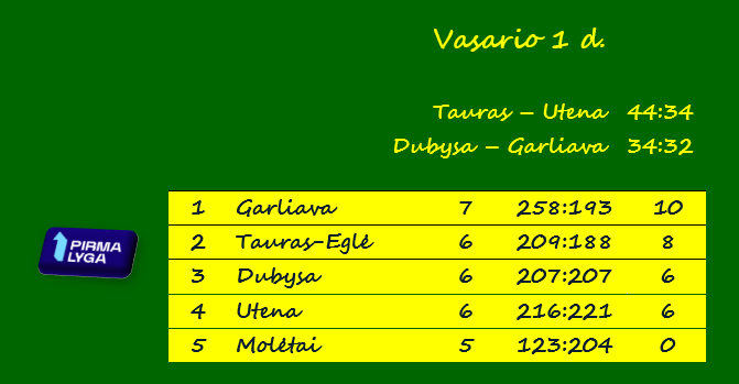 Lietuvos moterų rankinio pirmojoje lygoje sekmadienį įvyko dvejos rungtynės, kuriose pergales pasiekė namie žaidusios komandos. Vilniaus „Tauras-Eglė“ nugalėjo „Uteną“ 44:34 (21:15), Šiaulių „Dubysa“ – lyderę „Garliavą“ 34:32 (15:13).