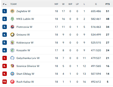 Pirmauja: „Zaglębie“ – 51, „Lublin“ – 48, „Piotrcovia“ – 34, „Gniezno“, „Kobierzyce“ – po 27, „Koszalin“ – 24, „Halyčanka“ – 21, „Sośnica“ – 16, „Start“ – 14, „Kalisz“ – 5.
