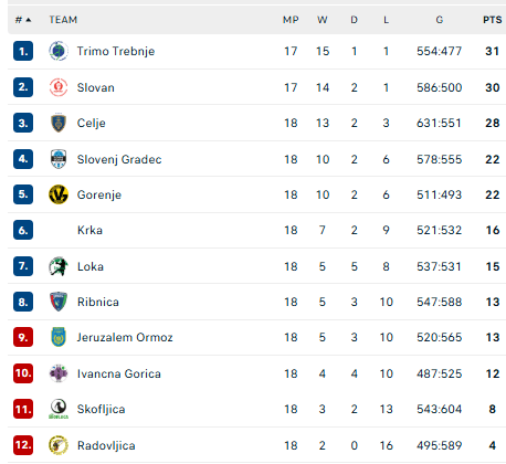 Pirmauja: „Trimo“ – 31, „Slovan“ – 30, „Celje“ – 28, „Slovenj Gradec“ – 22, „Gorenje“ – 22, „Krka“ – 16.