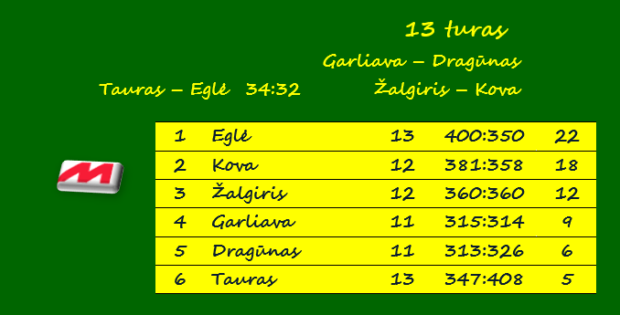 Pirmąją vietą užimanti „Eglė“ per 13 rungtynių iškovojo 22 taškus. Panevėžio „Kova“ atsilieka 4 taškais, bet ši komanda žaidė vieneriomis rungtynėmis mažiau.