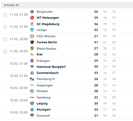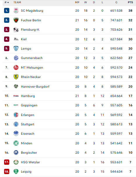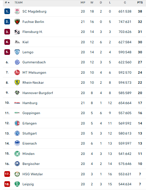 „Magdeburg“ – 38, „Füchse“ – 32, „Flensburg“ – 31, „Kiel“ – 30, „Lemgo“ – 30, … „Stuttgart“ – 13, „Minden“ – 11, „Bergische“ – 10.