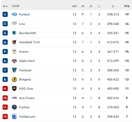 Pirmauja: „Ferlach“ – 19, „Linz“ – 16, „Barnbach“ – 15, „Tirol“ – 15, „Krems“ – 15, „Alpla“ – 14, „Vöslau“ – 13, „Bregenz“ – 13.