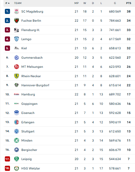 Pirmauja: „Magdeburg“ – 38, „Füchse“ – 34, „Flensburg“ – 33, „Lemgo“ – 32, „Kiel“ – 32, … „Stuttgart“ – 13, „Minden“ – 11, „Bergische“ – 10.