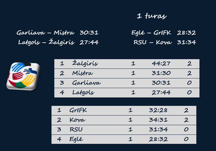 | Įvarčiai | A.Ustilaitė, Garliava (su Mistra), Selivončikaitė, Žalgiris (su Latgols) | A.Ustilaitė, Garliava (su Mistra), Selivončikaitė, Žalgiris (su Latgols) |