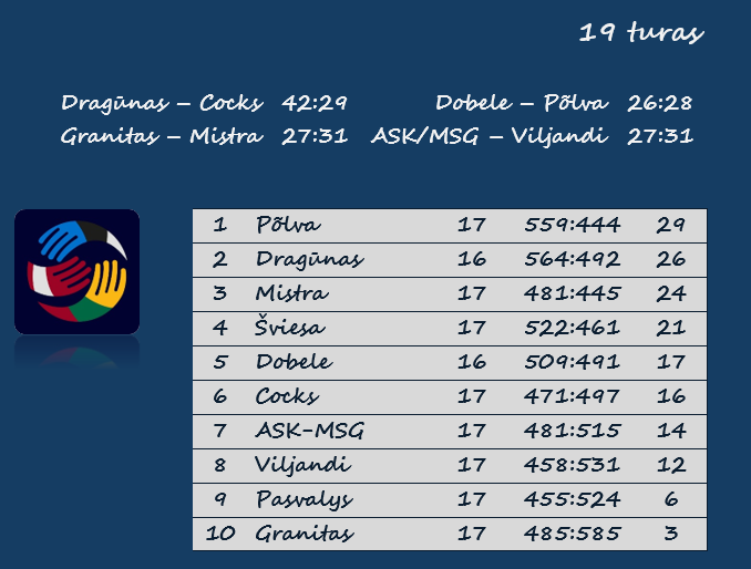 Duobelės „Tenax“ – Pylvos „Serviti“ 26:28 (11:15). Pančenko 9, Kreicbergas 4 / Varulas 6, Timmo 5, Rooba 4, Rebane 4.