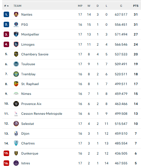 Pirmauja: PSG, „Nantes“ – po 31, „Montpellier“ – 27, „Limoges“ – 24, … „Istres“ – 5.