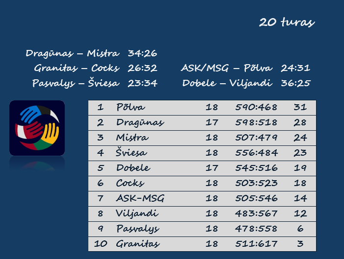 Kitos dvejos rungtynės vyko Latvijoje. „Tenax“ įveikė „Viljandi“ 36:25, ASK-MSG pralaimėjo „Serviti“ 24:31.