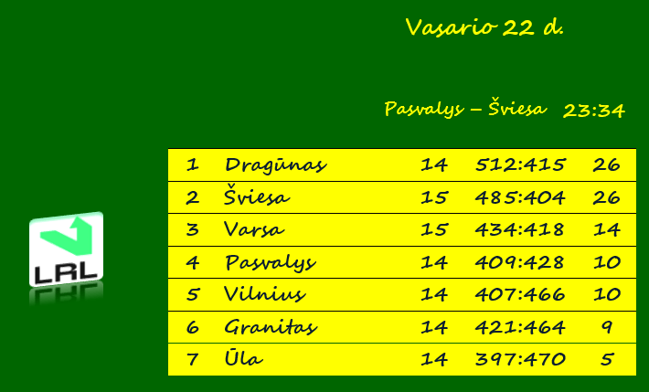 Lietuvos lygoje „Šviesa“ pagal taškus pavijo Klaipėdos „Dragūną“. Abi komandos iškovojo po 26 taškus. Tačiau klaipėdiečiai žaidė dar tik 14, vilniečiai – jau 15 rungtynių. Be to, „Dragūnas“ turi pranašumą ir pagal tarpusavio rungtynių rezultatus.