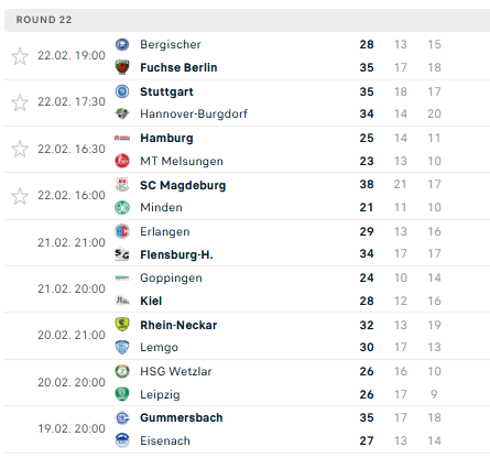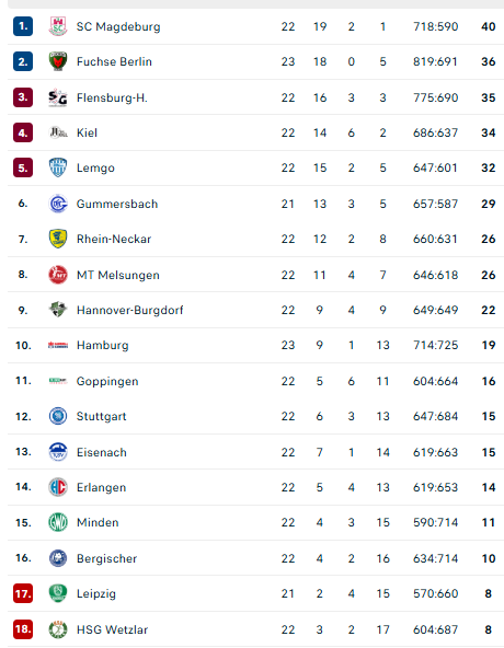 Pirmauja: „Magdeburg“ – 40, „Füchse“ – 36, „Flensburg“ – 35, „Kiel“ – 34, „Lemgo“ – 32, … „Stuttgart“ – 15, „Minden“ – 11, „Bergische“ – 10.