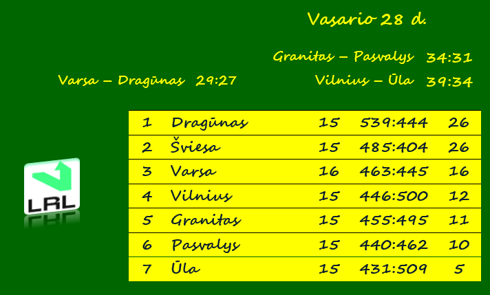Šeštadienį įdomiai vyko ir kitos dvejos Lietuvos vyrų lygos rungtynės, taip pat pasibaigusios šeimininkų pergalėmis. Kauno „Granitas“ įveikė Pasvalio „Pieno žvaigždes“ 34:31 (17:17), „Vilnius“ – Varėnos „Ūlą“ 39:34 (18:17).