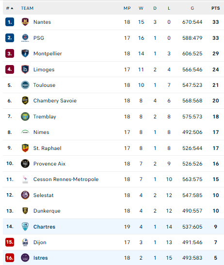 Pirmauja: PSG – 33, „Nantes“ – 33, „Montpellier“ – 29, „Limoges“ – 24, … „Istres“ – 5.