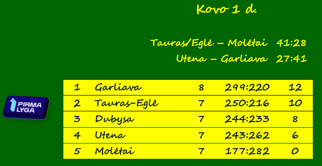 „Garliava“ per 8 rungtynes iškovojo 12 taškų. Kitos komandos žaidė po 7 rungtynes. „Tauras-Eglė“ turi 10 taškų, Šiaulių „Dubysa“ – 8, „Utena“ – 6. Paskutinę vietą užimantys „Molėtai“ pralaimėjo visas 7 rungtynes.