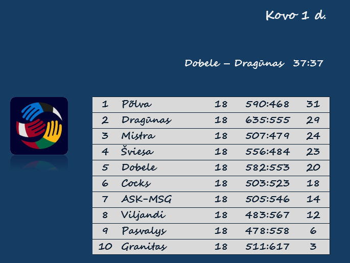 | Skirtumas | 17 – Dobele (su Granitu), Põlva (su Cocks) |