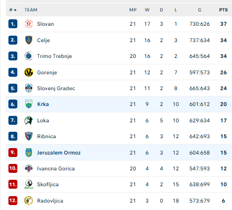Pirmauja: „Slovan“ – 37, „Celje“ – 34, „Trimo“ – 34, „Gorenje“ – 26, „Slovenj Gradec“ – 24, „Krka“ – 20.