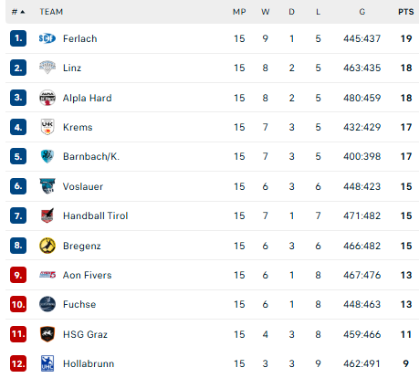 Pirmauja: „Ferlach“ – 19, „Linz“ – 18, „Alpla“ – 18, „Krems“ – 17, „Barnbach“ – 17, „Vöslau“ – 15, „Tirol“ – 15, „Bregenz“ – 15.