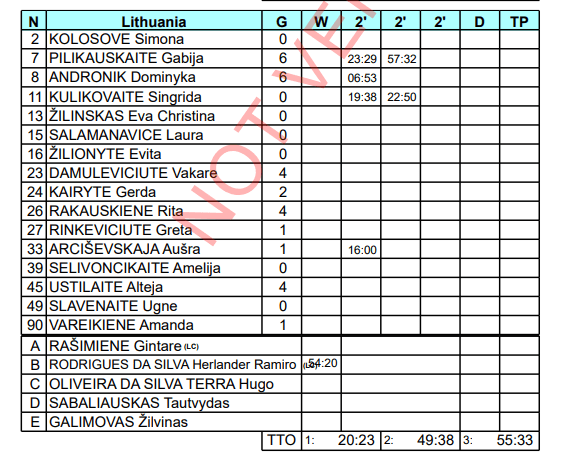 Lietuva: D.Andronik 7, Pilikauskaitė 5, Damulevičiūtė 4, Rakauskienė 4, A.Ustilaitė 4, Kairytė 2, Arciševskaja 1, Rinkevičiūtė 1, Vareikienė 1.