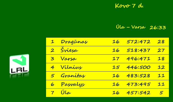 | Praleisti įvarčiai | 21 – Pasvalys (su Ūla), Dragūnas (su Vilniumi) | |