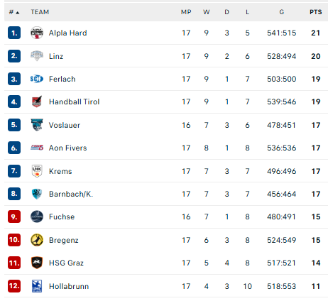 Pirmauja: „Alpla“ – 21, „Linz“ – 20, „Ferlach“ – 19, „Tirol“ – 19, „Vöslau“ – 17, … „Bregenz“ – 15.