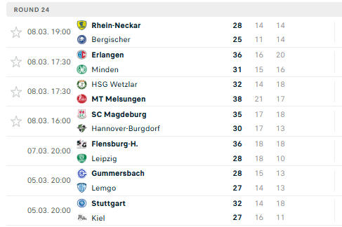 Pirmauja: „Magdeburg“ – 44, „Flensburg“ – 39, „Füchse“ – 38, „Lemgo“ – 34, „Kiel“ – 34, „Gummersbach“ – 33, … „Bergische“ – 12, „Minden“ – 12.
