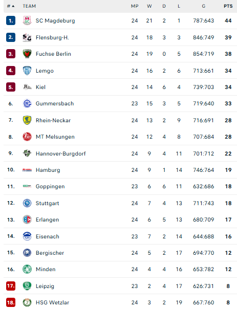 Pirmauja: „Magdeburg“ – 44, „Flensburg“ – 39, „Füchse“ – 38, „Lemgo“ – 34, „Kiel“ – 34, „Gummersbach“ – 33, … „Bergische“ – 12, „Minden“ – 12.